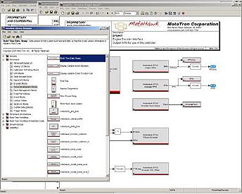 MotoHawk supports a "model based" workflow where an application is largely developed and tested in a simulated environment. Simulink™ from MathWorks® provides the development and simulation environment to build a wide range of applications. Models of the device being controlled are used to test complex features in the system without spending expensive time in test cells or on the actual vehicle. With a simulation tested control algorithm, the application can be re-targeted to the embedded control system for execution in the real time environment against the actual system. MotoHawk adds the ability to target and interact with the application in a real time control system. Along with allowing the control designer to interface to the IO of the module, the MotoHawk suite includes tools that allow you to monitor and adjust the system at run time. The enture suite allows a complete control application development lifecycle be performed in a relatively shorter timescale than traditional processes. The Simulink™ portion of the suite contains a custom blockset and scrips for Simulink™ that provide: